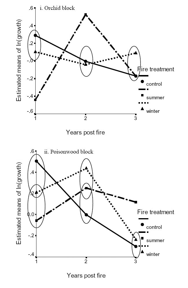 In the Orchid block (Fig. D1i), stem growth in the control (P = 0.001) and winter-burn treatments (P = 0.023) were significantly greater than summer-burn treatment at year one post fire. The pattern was reversed at year two post fire, in which stem growth was significantly greater than control (P = 0.017) and winter-burn treatments (P = 0.012). At year three post fire, no significant difference was seen among the three treatments.
