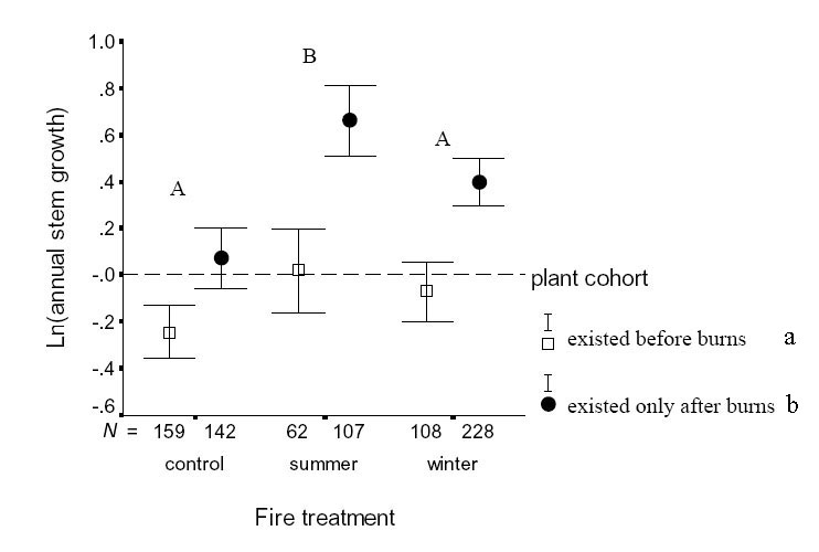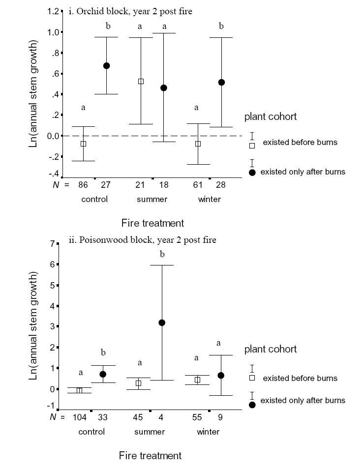 In Orchid block, plants that existed only after the burns had greater annual stem growth than plants that existed before burns during the second year post fire, in both the control and winter-burn treatment (Fig. D2). However, no difference was seen between the two cohorts of plants in the summer-burn treatment.
