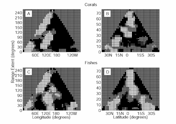 Fig. C.5. Midpoint deviation plots. Gray indicates midpoint densities whose values are within 99% of simulated midpoint densities. White and black indicates midpoint densities that are above and below these confidence limits, respectively. (A) Corals, longitude. (B) Corals, latitude. (C) Fishes, longitude. (D) Fishes, latitude. Compare with Fig. 6 in the text.