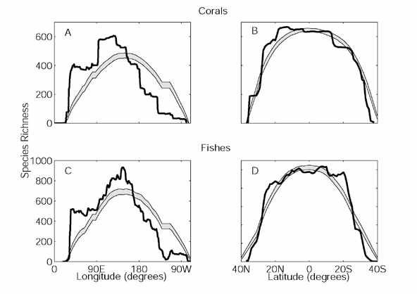 Fig. C.1. Observed longitudinal and latitudinal species richness patterns, plotted with predicted values under the mid-domain model. (A) Corals, longitude. (B) Corals, latitude. (C) Fishes, longitude. (D) Fishes, latitude. Shaded areas encompass 99% of the species richness values obtained from the randomizations (i.e., all but the lower and upper 0.5% of randomized species richness values). Compare with Fig. 2 in the text.