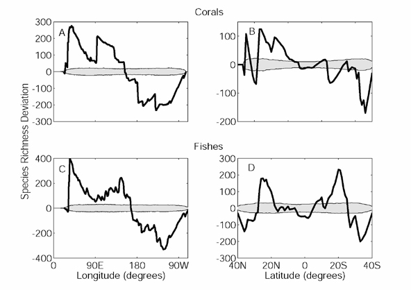 Fig. C.2. Observed longitudinal and latitudinal species richness patterns, expressed as deviations from species richness predicted by the mid-domain model. Shaded areas represent 99% confidence limits on the range of deviations expected by chance alone. (A) Corals, longitude. (B) Corals, latitude. (C) Fishes, longitude. (D) Fishes, latitude. Compare with Fig. 3 in the text.