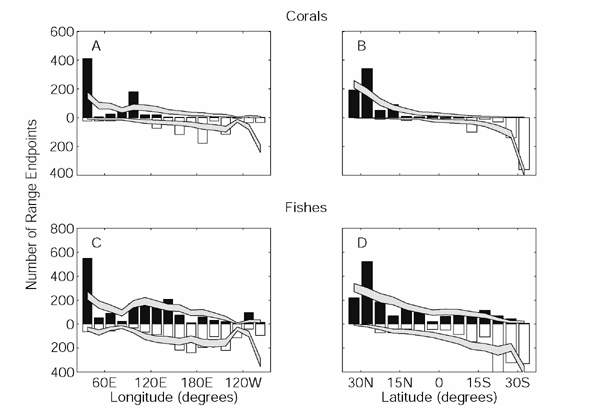 Fig. C.3. Observed distribution of range endpoints (bars), and expected distribution based on mid-domain randomizations (shaded region encompasses 99% of randomizations). (A) Corals, longitudinal limits. (B) Corals, latitudinal limits. (C) Fishes, longitudinal limits. (D) Fishes, latitudinal limits. Compare with Fig. 4 in the text.