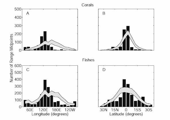 Fig. C.4. Observed distribution of range midpoints (bars), and expected distribution based on mid-domain randomizations (shaded region encompasses 99% of randomizations). (A) Corals, longitudinal midpoints. (B) Corals, latitudinal midpoints. (C) Fishes, longitudinal midpoints. (D) Fishes, latitudinal midpoints. Compare with Fig. 5 in the text.