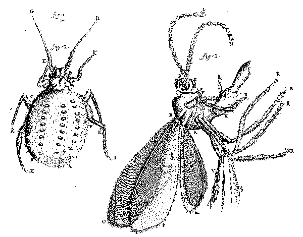 ![]() Fig. 10. Leeuwenhoek’s Fig. 1 is a “green louse” (aphid) natural size; his Fig. 2 is an aphid shell seen under a microscope, from which a fly had emerged at the bottom; his Fig. 3 is a parasitic fly that emerged from an aphid (26 October 1700, Royal Society of London Philosophical Transactions 22:facing p. 655). |