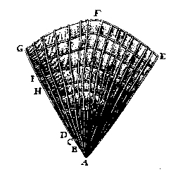 Fig. 11. Leeuwenhoek’s cross-section drawing of an oak trunk was given as a pie-shaped wedge rather than in full circle as is the modern custom; he said the oak tree was 12 years old and 4 2/6 inches in diameter (written 10 July 1686, but not published until the September–October 1694 issue of the Royal Society of London Philosophical Transactions 18:facing p. 193). |