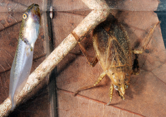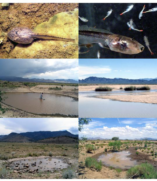 | (Top pair) Plains spadefoot toads (Spea bombifrons) and Mexican spadefoot toads (S. multiplicata) potentially co-occur in the southwestern United States, where their tadpoles develop into either an omnivore morph that eats detritus (left photo) or a carnivore morph that eats fairy shrimp (right photo). In allopatry, both species produce carnivores and omnivores. In sympatry, however, selection to minimize competition has caused S. bombifrons to produce all carnivores, and S. multiplicata to produce all omnivores.