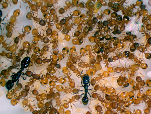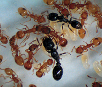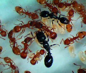 | A host colony of Temnothorax curvispinosus parasitized by the slave-maker ant Protomognathus americanus and the inquiline ant Temnothorax minutissimus. Both are specialized social parasites, but slave-makers steal the young from host colonies to augment their slave supply. Inquiline ants, having lost the worker caste, spend their entire life cycle within a host colony. The degree of specialization shapes the trajectory of parasite–host coevolution and contributes to the geographic mosaic.