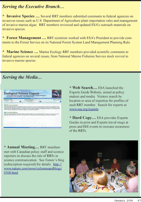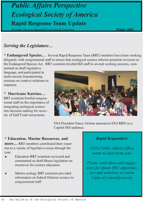 Applied Ecology Section NewsletterHistory and mission The Applied Ecology Section of the Ecological Society of America is the second largest and the third oldest of the active sections within the Society. The Section was established in 1971 and has a twofold purpose: 1) To facilitate communication about applying ecological principles to solve practical environmental problems, and Call for nominations for Section officers for 2006–2007 Article 5. OFFICERS. The officers of the Section shall be a Chair, Vice-Chair, and Secretary. The Officers shall comprise the Section Executive Committee and may act on behalf of the section during intervals between annual meetings. Voting for Officers shall be by either mail or by email ballot distributed to members in odd numbered years. Officers shall serve for a term of two years and not be eligible for re-election. The Chair and Secretary assume office in the year the election is held, and the Vice-Chair assumes office the following year. Article 6. CHAIR. The Chair shall preside at the business meetings of the Section, authorize expenditures of Section funds, and shall promote in every practical way the interests of the Section. The Chair shall appoint a Nominating Committee, which shall prepare a slate of candidates for each office. Article 7. VICE-CHAIR. The Vice-Chair shall be responsible for arranging the scientific program for all meetings of the Section, and shall assume the duties of the chair whenever that person is unable to act. Article 8. SECRETARY. The Secretary shall keep the records of the Section and an up-to-date membership and mailing list, and shall perform such other duties as may be assigned by the Chair. Duties that may be assigned by the Chair can include: submits information to ESA Bulletin by 15 January, April, July, and October for publication in the next ESA Bulletin; takes minutes at the annual meetings; maintains and updates the web page; assists the Chair and Vice Chair with distributing information and other tasks as deemed by the Chair; assists with organizing and tallying votes for the Student Travel Award; counts ballots for elections. Please send nominations, including a one-paragraph biosketch that describes your vision as an Officer of the Applied Ecology Section, by 15 May 2006 to the Nominations Chair: Becky Kerns, Research Ecologist Officers for 2004-2006 Co-Chairs: Vice Chair Secretary Student Travel Awards The Applied Ecology Section will support students in their efforts to present their work at the 91st ESA Annual Meeting in Memphis, Tennessee, 6-11 August 2006. The Section is now calling for nominations for scholarships, with individual awards up to $750 depending on the funding available and number of qualified applicants. The deadline for receipt of applications is 15 May 2006. Instructions and details for the application process can be found at the Applied Ecology Section web page at ‹http://www.esa.org/applied/› Last year’s scholarship recipients were able to present their research at ESA’s 90th Annual Meeting in Montréal. The amount of each award and the name and address of each student are listed below. Susan Tilley’s award came from the Applied Ecology Section’s long-range planning grant, which was awarded on 21 December 2004. The other awards came from the Section’s overall funds.