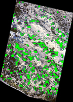 | A series of three images demonstrating use of GIS to extract patch density data from large-scale aerial photos of dune vegetation on the Central California coast. Silver dune lupine is the preferred host of western tussock moth at Montaña de Oro State Park, California. Field surveys of the moth matched against spatial data of lupine distribution showed that this poorly mobile moth is more abundant on isolated host plant patches, due to reduced pupal parasitism rates.(Left) A georeferenced aerial photo of a 100 × 150 m area of coastal dune habitat. (Center) A color-classified representation of the photograph, with lupine patches denoted by light-green polygons. (Right) The lupine polygons, filtered and smoothed for noise reduction, and overlaid on the photograph. |